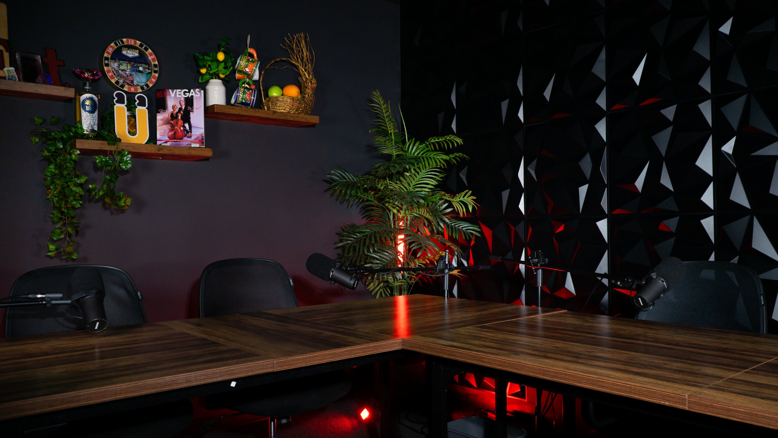 Versatile, modern space designed to comfortably accommodate 2–3 people. Outfitted with up to four professional microphones and three-camera setup. The sleek, gray-toned design gives the room a clean, contemporary feel that looks great on camera.